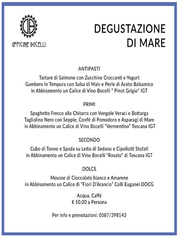 Su prenotazione: 0587 398143 o officinebocellifoodcourt@gmail.com